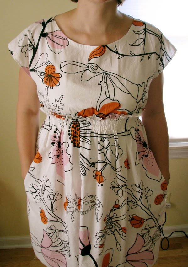 I had a crisis a couple weeks ago when I realized I really had no nice dressy things for dinners out (due to my post-partum body redistribution and slight weight gain...ack!), so I threw this dress together in a day or so. The cut is very simple, really just a couple of shaped rectangles. I pleated the waistband and then shirred it with elastic thread ala Heather Ross' Weekend Sewing shirring technique (BTW I just went to her blog to get the link, started reading, and oh my dear goodness is that woman ever funny. Do yourself a favor and subscribe if you haven't already).