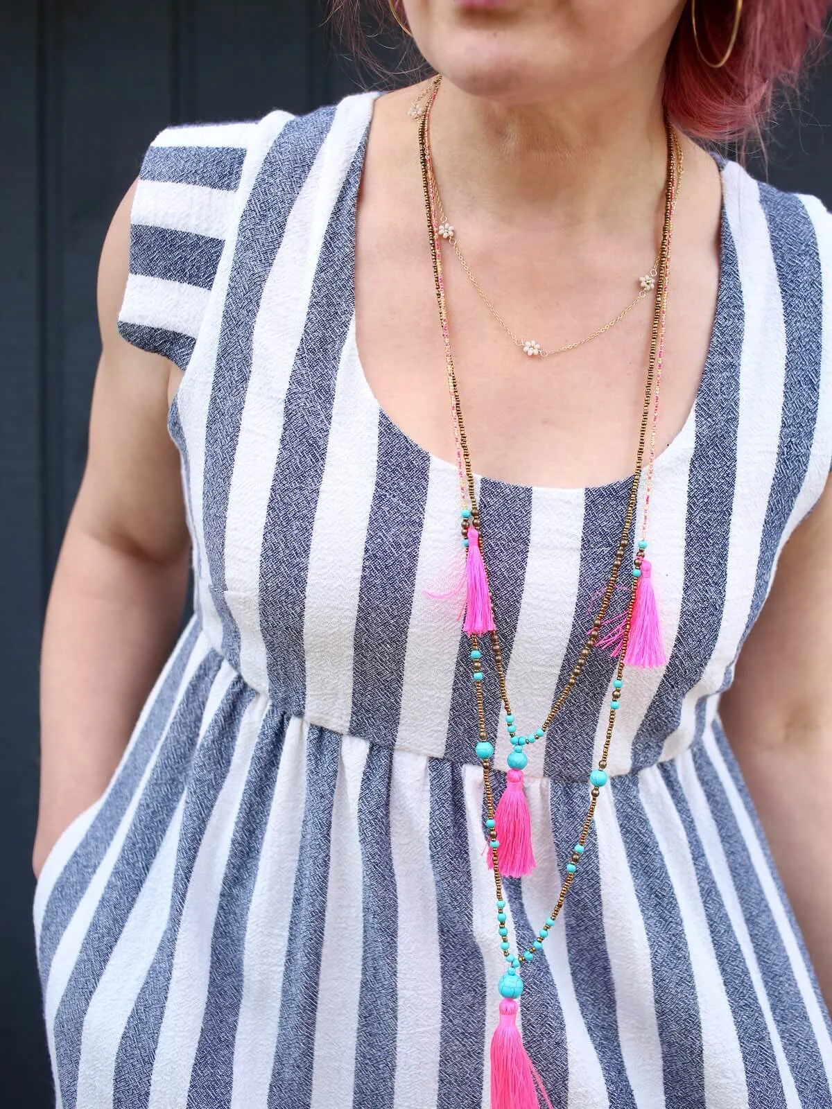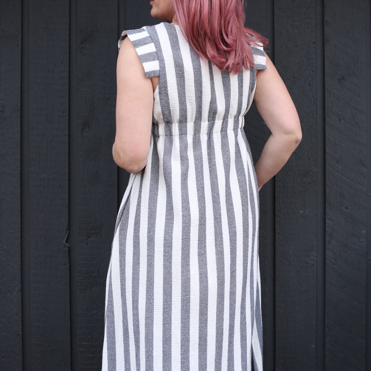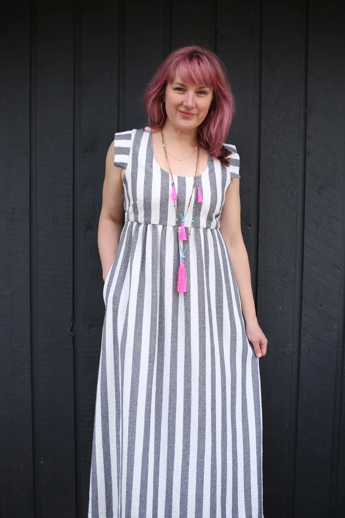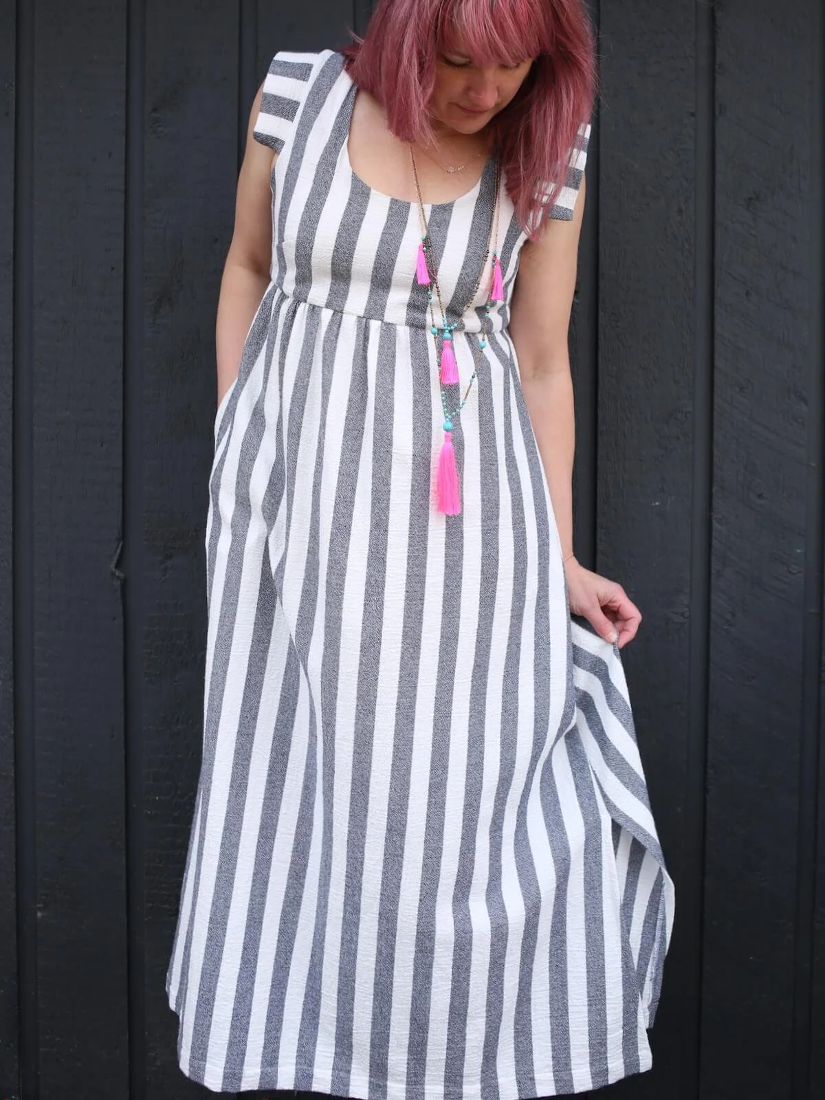 The inspo for this dress came last year when I saw this dress from Curator on Pinterest that looked like exactly something I could recreate with a wide stripe fabric and the Expansion Pack. I found the striped fabric at Stonemountain and Daughter, one of my go-to locations when I’m shopping for apparel fabrics. The base pattern is the Trillium Dress of course, with a gathered skirt and 1” elastic in back instead of the shirring (View B of the Expansion, or this tutorial), and used the pointed sleeve and lining from View C of the Expansion Pack. I also lengthened the skirt to make it a maxi-dress (not part of the Expansion, but tutorial for that here). The upper portion of the dress is lined, and the lower portion is not. And of course, it has POCKETS!!